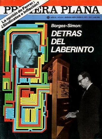 In the works of Borges, the supreme recursive objects are libraries and labyrinths. I have made reference to ‘The Library of Babel’ – itself a labyrinth – and we know from various sources that the labyrinth was a foundational myth for young Georgie, as he was known by his family. In 1971 Borges was interviewed by the Economics Nobel laureate and renowned computer scientist Herbert Simon, one of the founding investigators of Artificial Intelligence, who was visiting Buenos Aires. This improbable meeting of minds was set up at Simon’s request. The conversation took place in English. In attendance, but not participating, was the writer Gabriel Zadunaisky, who recorded and translated the interview for the weekly journal Primera Plana.[5]